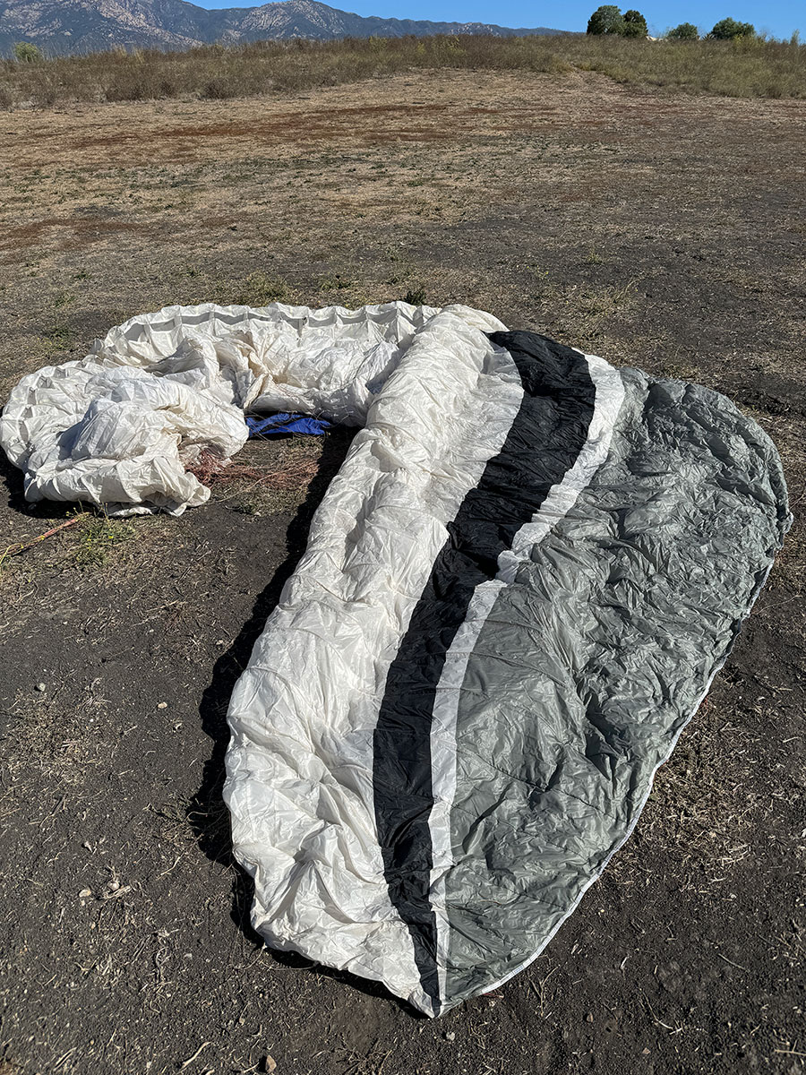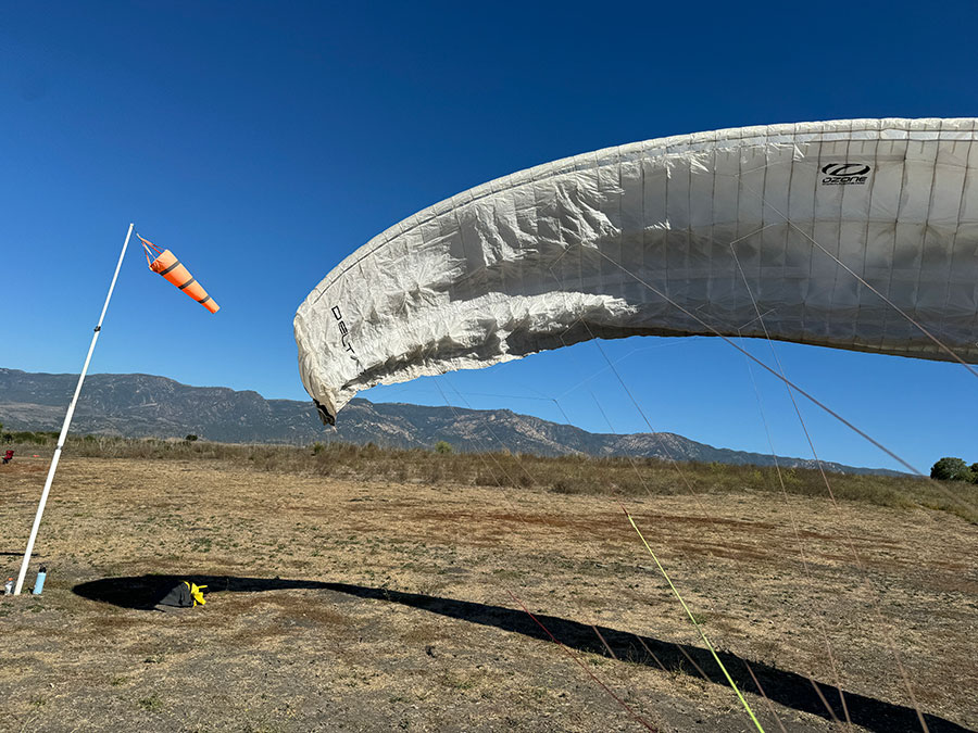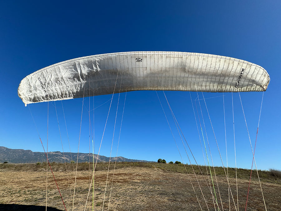 This listing is for a gently used Ozone Delta 3 Paraglider in size ML with a Stuff Sack as shown. NO HARNESS, NO HELMET. Glider is in good shape, with about 60 hours of flight time. It was only used by the original owner.. No damage, no tears, no repairs, all original risers and lines. Color is White/Black/White/Grey as shown in pictures, size ML. Certified Weight Range: 85-105. Recommended Flying Weight: 90-104 kg. This item is available for Certified Paraglider pilots only, you must be able to confirm this and verify with references prior to purchasing.