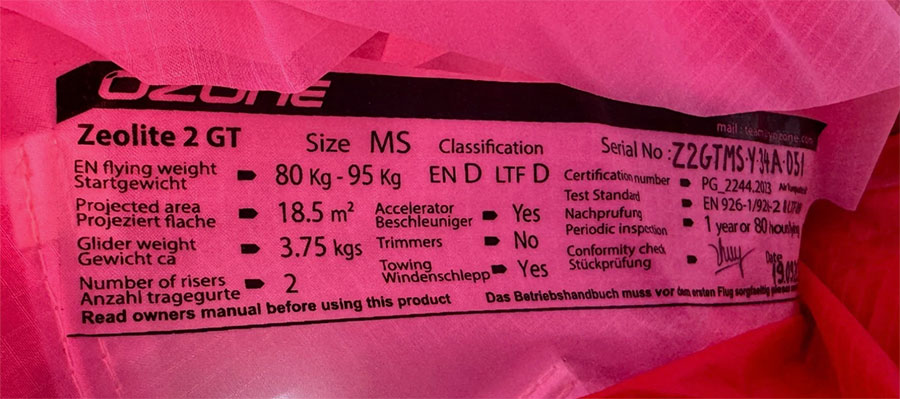 This listing is for a gently used Ozone Zeolite 2 GT Paraglider in size MS with an Ozone Easy Bag Stuff Sack. NO HARNESS, NO HELMET. Glider is in excellent shape, with about 10 hours of flight time. It was used by the original owner sporadically until they upgraded to another lightweight advanced glider. No damage, no tears, no repairs, all original risers and lines. Color is RedBlackWhite/Red as shown in pictures, size MS. Recommended Flying Weight (kg): 80-95. This item is available for Certified Paraglider pilots only, you must be able to confirm this and verify with references prior to purchasing.