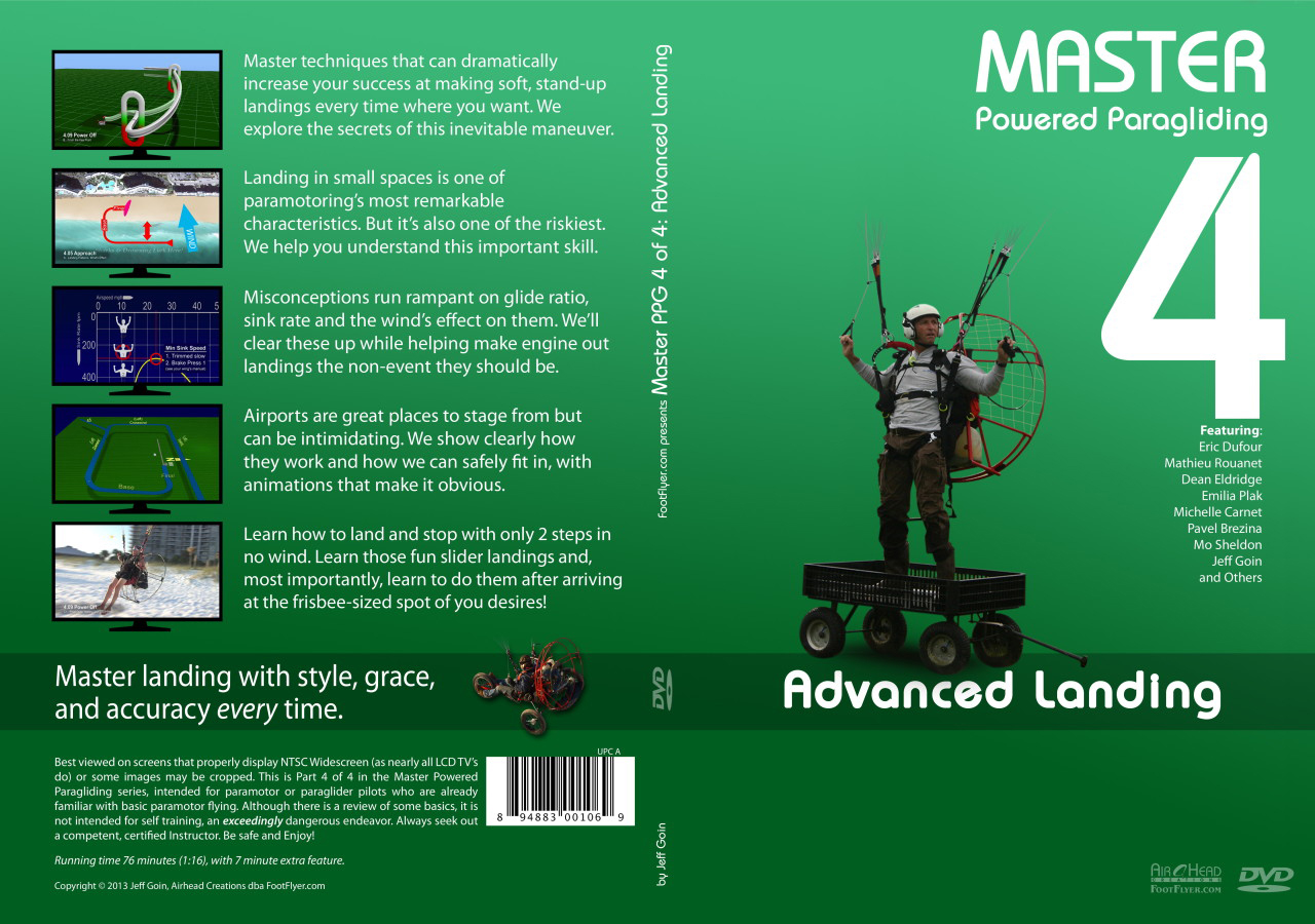 DVD - MASTER Powered ParaglidingAdvanced LandingPart 4 of 4 in the Master Powered Paragliding Series. Master landing with style, grace and accuracy EVERY time. Working with some of the best pilots in the world we thoroughly show and explain techniques that can dramatically increase your success at making soft, stand up landings every time on the spot of your choosing. We explain how to handle engine-out landings in many situations that involve different glide decisions with variations of winds and terrain. As with the rest of the series it uses a combination of live action, 3D animations, 2D animations and other graphics to clarify exactly how the techniques work. Everything from nailing one-step spot landings to the graceful slider arrivals that make you look like a pro.
