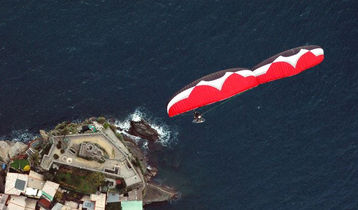 Ozone Power GlidersOzone was created in 1998 by a group of passionate PG pilots from England, including the only double world champions of hang gliding and paragliding; Rob Whittall and John Pendry. The aim was to create a company of pilots designing wings for pilots to give performance at all levels, never forgetting safety. Today Ozone is one the top companies in paragliding and power kites and is working hard to bring those talents to the paramotoring and kitesurfing worlds. Mathieu Rouanet, originally a free flight paraglider pilot, flew paramotors with a standard paraglider from Ozone and loved the feel of it. Being seriously involved in the competition scene, he came to us to see if we would be interested to make a special PPG wing for him to be more competitive. The aim was to keep the excellent performance in sink rate and glide of our paragliders, the lightness and ease of inflation, the “Ozone” touch in the handling, but adding the possibility of reaching very high speed plus high stability to compete against the “Reflex” type wings, which at the time were setting new standards in PPG competitions. This is how we became seriously involved in paramotoring in 2005. PPG / Free flying – the differences: The major difference comes from the power source. While free flying the pilot needs natural lift to stay in the air, and of course while paramotoring, the pilot has an engine. Although some of the fundamentals remain the same, the engine changes the design requirements of the wing. You obviously have better chances of flying often with a motor as you don’t depend on the weather as much. Because the pilot doesn’t need to wait for thermals or wind to soar, which in fact are sources of turbulences, you will generally fly in calmer / smoother conditions. So you don’t have to run around to find the right site where the wind is blowing the right direction, you don’t have to wait the perfect conditions to stay in the air, and because you can avoid the sources of turbulence, paramotoring can be attractive. In free flying, you need to stay in the air with these natural sources of lift, so the performance factor of the wing (sink rate and pure glide) is quite important, whereas in PPG, as long as you have enough power to get off the ground you don’t really need the same sort of performance. Instead, because you want to cover some distance and enjoy flying over the country, speed is a more important factor. Ease of launch has always been an important point for both. But it has to be said that with 30kg of gear on your back in no wind and on a flat field, you want to make sure your wing will launch easily the first time. The effect of the motor on the glider is very specific and can only be experimented by flying with an engine. The motor affects the roll, damaging the quality of the turn. For both sports, a glider that rolls a lot with short brake range and high spin tendency would not be ideal. The turn ability of a wing is quite important in free flying as it’s nice to be able to stay in the core of the thermal, in a small area of lift, or even to land in a tiny field. In the past it has not been seen as important in PPG as most the flying is done in a straight line at high speeds. However, in the future PPG pilots will realize that precision is a very important feature in a wing. More and more pilots will realize how fun it is to play near the ground and with the terrain, and in order to do this precise and agile handling is the key. Because of what I have explained above, performance in glide and sink rate for free flying and speed for the motor, it is obvious that wings need developing specially for each category. Everybody in PPG today has heard about “auto-stable” or “reflex” airfoils. Here is the simple explanation of the benefits of this type of airfoil: As I’ve said earlier, pilots want to fly fast to cover long distances, so needed in the concept is everything to make a paraglider fly at low angle of attack (to go fast) with maximum stability. The “reflex” airfoil acts as an automatic system that helps the wing to handle turbulence by delaying the point of break (collapse) by positioning the lift forces quite far forward on the profile. In effect, the more you accelerate, the more effective the reflex is and the more solid your wing becomes: This means it’s more solid, but as I’ll explain bellow, that doesn’t mean it’s safer! Also, a reflex profile is usually associated with poor aerodynamic performance. In order to achieve maximum speed, a competition reflex wing my require 100% thrust in order to maintain level flight in trimmers out / fully accelerated position. This is the case with the Viper, for instance, which is designed with an emphasis on speed. So to summarize, reflex profiles have been developed for speed in paramotoring and is the best known solution for speed with a certain amount of solidity and comfort in flight.