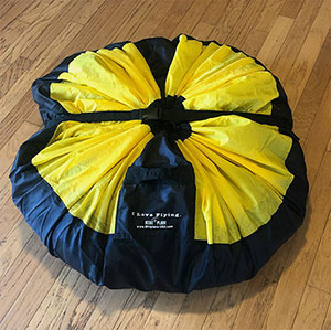 Simply gather your paraglider wing into a ball using the lines, and set it into the center of the Stuff Sack laid out on the ground. Lift the drawstring around the glider and pull the string tight. There is also a cinch belt to make the stuffed glider a bit more compact for easy carrying.