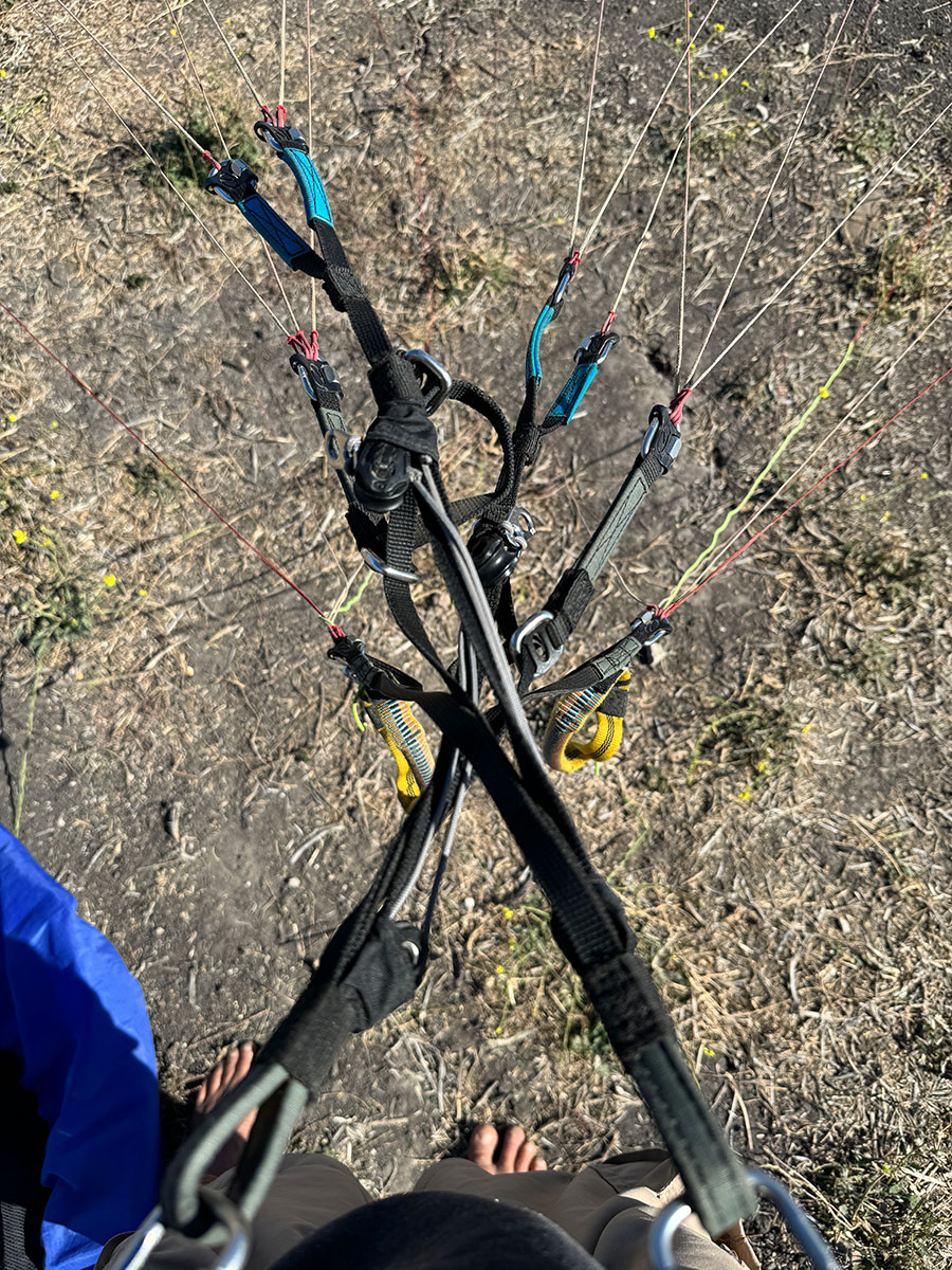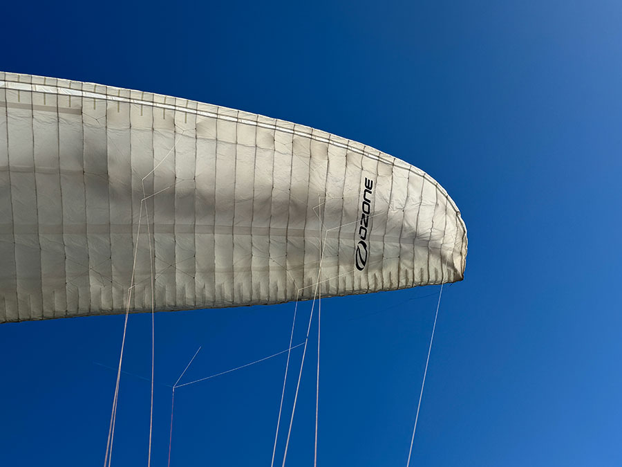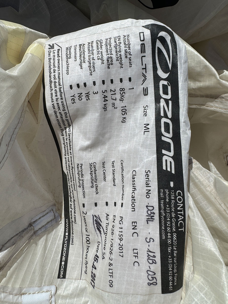 This listing is for a gently used Ozone Delta 3 Paraglider in size ML with a Stuff Sack as shown. NO HARNESS, NO HELMET. Glider is in good shape, with about 60 hours of flight time. It was only used by the original owner.. No damage, no tears, no repairs, all original risers and lines. Color is White/Black/White/Grey as shown in pictures, size ML. Certified Weight Range: 85-105. Recommended Flying Weight: 90-104 kg. This item is available for Certified Paraglider pilots only, you must be able to confirm this and verify with references prior to purchasing.