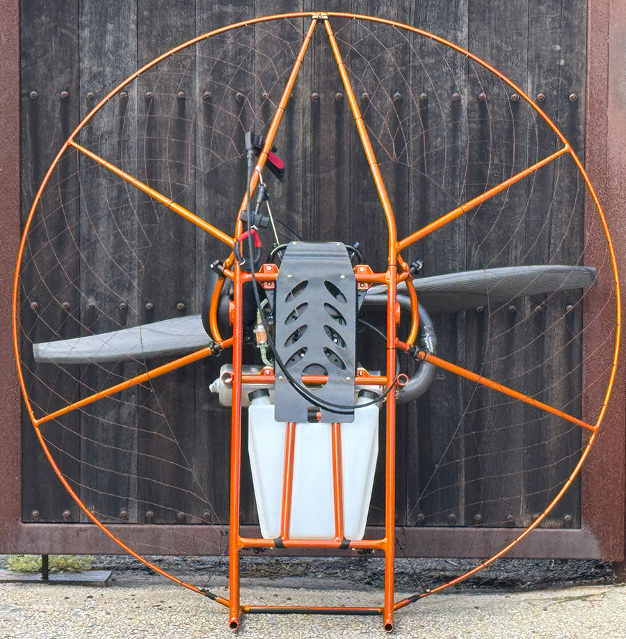 In general, every aspect of performance is improved. There is better efficiency of the propeller (higher aspect ratio) so more thrust is obtained with less energy consumption. A larger propeller needs adequate protection that is not offered by Miniplane's traditional flexible fiberglass ring cage. The solution for propeller protection is Miniplane's new cage built with a high strength aluminum drop-shaped aerofoil profile. The new reduction ratio makes the propeller turn more slowly. Thanks to this increased efficiency, during horizontal flight the noise is greatly reduced making the flight more relaxing for the pilot with less noise disturbance for those who are watching from the ground. The new lightweight composite E-Props propeller becomes a necessary and excellent choice for this paramotor, because it is impossible to achieve the same performance with a large wooden propeller. A further advantage is that the profile used for this carbon fiber propeller keeps performance high even as air density decreases, as it maintains thrust as the height increases. While the Static thrust is increased a bit, the real benefit is the climb rate especially at altitude. Most of this extra performance comes from the longer and wider propeller catching more air outside the disturbed airflow of the pilot.