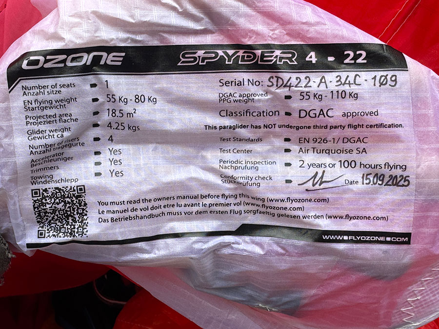 This listing is for a gently used Ozone Spyder 4 PPG Power Glider in size 22m with an Ozone Easy Bag Stuff Sack- NO HARNESS, NO HELMET. Glider is in perfect shape, with about 1 hour of flight time. It was only used by the original owner (myself) with my Miniplane Long Range Paramotor - this glider also works great with PPG Trikes. No damage, no tears, no repairs, all original risers and lines. Color is as shown in pictures, size 22m. Recommended Flying Weight (kg): 55-110. Retail price for this new glider is $4,650. This item is available for Certified PPG Paramotor and/or PPG Trike Pilots only, you must be able to confirm this and verify with references prior to purchasing.