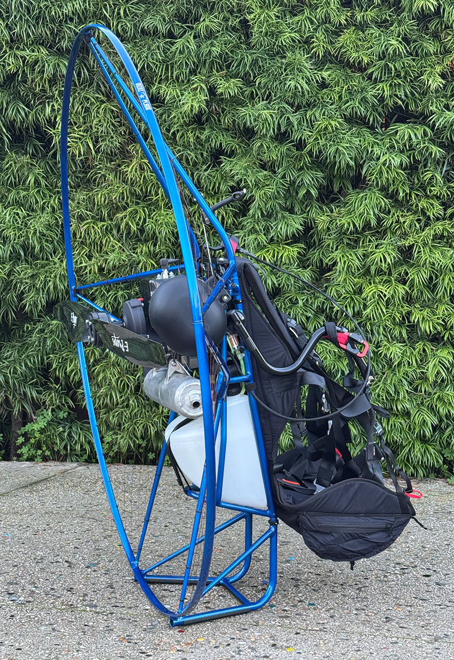 PRE-TARIFFS! Take advantage of stock that we bought before the tariffs went into effect! The regular price of this paramotor now is $7,200!This listing is for a USED Miniplane Rigid Cage 150 4-Piece Cage Paramotor with the Top 80 Engine with a clutch. This Paramotor has only 2 flights on it so far, it was built to show at the recent "Brad Apples Fly-In" in Utah this fall. It is a beautiful Metal Blue Frame and Cage with the reliable Top 80 Engine with a 17:75 Redrive swinging a 135cm E-Props Propeller made for this unique Gearbox. Please note: This listing is for the Miniplane Rigid Cage 150 Paramotor with 4-Piece Cage with the 135cm E-Props Carbon propeller - no glider or helmet is included. This product is for Certified Paramotor pilots only, you must be able to confirm this and verify with references prior to purchasing this item or confirm that you are engaged in training with a certified Instructor. See more information about this Paramotor HERE. Email info@AmericanParagliding.com or call or text Chad at 805-403-1859 for interest or questions regarding this paramotor. Photos: